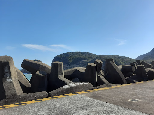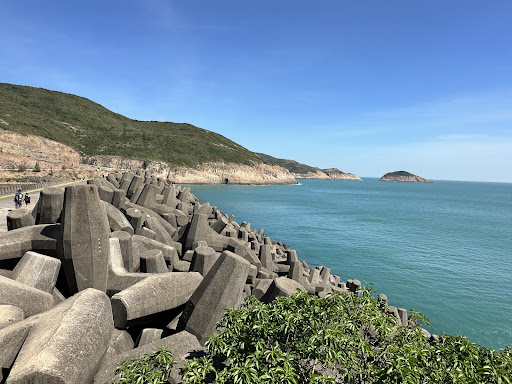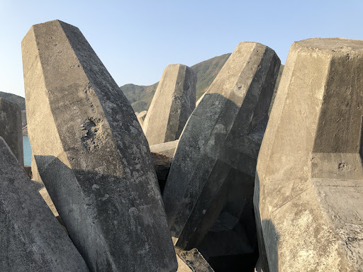 The breakwater in High Island Reservoir East Dam (萬宜水庫東壩)is composed of about 7000 double T-shaped concrete prefabricated components (wave breakers) called dolosse. Each dolos block can weight up to 20 tons. The main design is to stabilize the foundation of the coast in the form of dam construction to prevent the erosion of the tides. The tetrapod or wave breakers of the breakwater are anchor-shaped and they also look like 1-shape piers as well as giant toy building blocks when put together. Anchor-shaped tetrapods are more stable than ordinary twisted shape tetrapods. They have been exposed to sea waves for more than 40 years but they are still indestructible. In addition, the embankment is covered with numerous small holes to slow down the speed of water flow and reduce the damage caused to the dam by waves. There is a pathway the length of the Cofferdam (防波堤)just next to the top tiers of the dolos blocks. There are numerous signs warning people not to climb onto the...