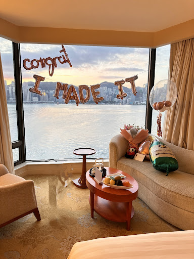 We had emailed the hotel in advance about arriving early and if it was possible to do an early check-in. We also let them know that we will be celebrating a very special anniversary. Not only did the hotel accommodate a super early check-in (7am), they also decorated the room with the most beautiful and welcoming reception. They had balloons put up that said “Congrats – I made it”, bouquet of flowers, a small stuffed animal for my 4yr old son, and a card with a very sweet message. It was so thoughtful and it was a great start to our journey in Hong Kong.