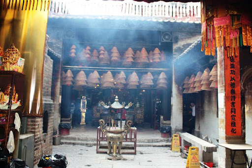 Outside of the temple, you'll find colourful mural scenes above the door. Within the temple, there is a small open courtyard, traditional shrine a neat collection deity figures and traditional incense coils typical of Chinese temples.