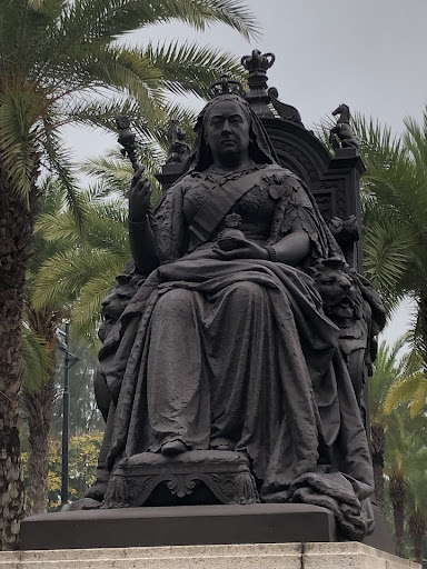 What you see is a bronze of an elderly Queen Victoria, in crown and coronation regalia. She is seated at her throne and holds a sceptre in her right hand and an orb in her left. It is a regal image that commemorated the 50th anniversary of Victoria ascending to the throne, a milestone date that had just past when the monument was commissioned in 1888 by the Hong...