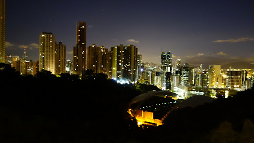 Here you find a sizeable platform area with a few circular benches with cover, these are useful when its hot and sunny or rainy outside. You'll find a sign which shows the buildings that make up the Hong Kong and Kowloon Skylines that you can see from this location. If you look to the right you can also see the Happy Valley...