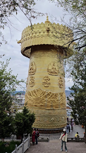 "Ngôi chùa này được xây dựng trên núi, mái vàng tỏa sáng dưới ánh mặt trời, như thể ánh sáng của Đức Phật vừa xuất hiện. Tại đây có bánh xe cầu nguyện lớn nhất thế giới & Bánh xe cầu nguyện lớn nhất thế giới không phải ở Tây Tạng mà ở Vân Nam. Người ta nói rằng nó được làm bằng đồng nguyên chất và được mạ vàng thật. Tứ đại Bồ Tát Văn Thù, Phổ Hiền, Quán Thế Âm và Địa Tạng được chạm nổi ở đầu trên của bức tường ống, trong khi Bát Bảo của Phật giáo được khắc ở đầu dưới. Ống này còn chứa kinh, thần chú, thần chú không lời và nhiều kho tàng Phật giáo khác nhau. Chiều cao là 21 mét và trọng lượng tổng thể khoảng 60 tấn. Nó cần hơn 10 người lớn để xoay nó. Người ta nói rằng mỗi vòng quay tương đương với việc niệm thầm danh hiệu Phật 1.240.000 lần. Cần phải xoay ba lần theo chiều kim đồng hồ để có tác dụng cầu nguyện. Ánh đèn của bánh xe cầu nguyện sẽ đẹp nhất vào ban đêm, đặc biệt là lúc 7 hoặc 8 giờ, khi bầu trời ở Vân Nam trong xanh.