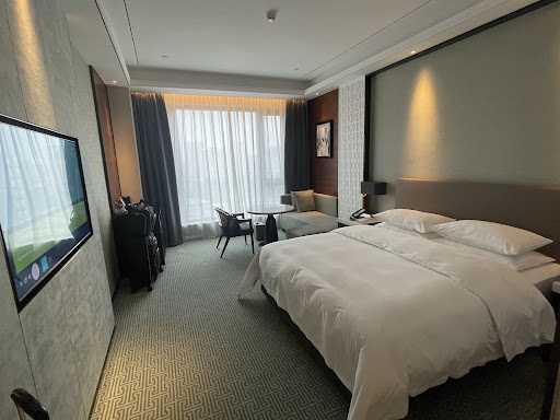 A very nice and spacious room with a comfortable bed and a great open view of the park and the mountains. The rooms have modern controls for the lights as well as motorized curtains, which made for convenience both when going to sleep and waking up in the morning. It was also nice that a phone charging cable with the three different adapters was provided. The bathroom is spacious and has a large sink and shower. It is nice that the shower has a choice of rainfall or regular nozzle. The shower controls were also very modern and you merely pushed the button for your preferred shower method. It seemed that the guest before me was unaware of this and had broken the temperature control and not reported it to the hotel. The front desk was quick to send a repair person who was very thorough in fixing the control. While the shower had good water pressure, it seemed at peak times that there was not enough hot water as the shower temperature was just slightly warm. To get a hot shower, I had to wait until late in the afternoon or late at night. The checkin was fast and the attendant was kind enough to honour my request for a non-smoking room on a high floor. The lobby is spacious with a nice tea area. It is also convenient to have a Starbucks inside the hotel. However, it was a bit noisy as other guests were not always mindful of the calibre of hotel they were in, which ranks in the 5 star category. It was difficult to try to get some work done with people playing videos loudly on their phones, talking on speaker phone or kids running around. This really took away from what should be a calming space. While the hotel attendants tried to maintain order, it really was a losing battle for them. The location is really dependent on what you are looking for. I found it nice to have the open park view but there are not many interesting restaurants around. For the middle eastern food, you need to bike about 1.5km. This was fine when the weather was good, but it was not convenient during the latter part of my stay when it rained all day. A few things to be aware of when booking. The breakfast was large with a lot of options but it really is a Chinese style breakfast. To call it Western and Chinese is quite misleading as there were only a few Western options, such as omelets. There is a great large screen television in the room, but only 2 or 3 English channels with the others in Chinese. There is a shuttle bus to the market, but it was a bit disappointing to learn that it only runs twice per day. The main area for the hotel to work on is its consistency of service. Some of the employees were outstanding but there seems to be a need for additional training. For example, the room came with a complimentary daily minibar, but I had to ask each day for it to be refilled. This was quite embarrassing to do, especially when the stocking was just some soft drinks with a single Tsingtao beer. Also, when I was in the toilet, one of the chefs walked out without washing his hands. While he may have washed them (hopefully) when he returned to the kitchen, he should be sure to wash them in front of guests. Lastly, the pool and fitness area seemed to require special access and the people working at the desk for the pool made me feel very uncomfortable when I wanted to see the facilities, so I just left and did not return. This was particularly disappointing because one of the reasons I booked the hotel was for these facilities. Overall it is a very nice hotel and I would book it again. But additional employee training would be appropriate so the service does not take away from what is a high...