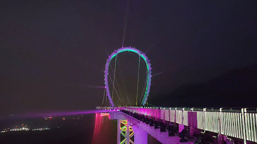 天门悬廊:总投资2.68亿,伸出山崖368米,环形悬廊长达168米,脚踏透明玻璃,惊险刺激,晚上有绚丽灯光秀。