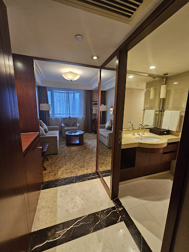 Read moreThe hotel is located in the west of Shanghai near the river and the Bund. It's about a 20-30min drive from the main train station and about an hour from Pudong Airport, these times are outside of rush hour later in the evening (about 8pm). ||Check in was easy thanks to my English speaking guide. I was given a room on the 20th floor, a lovely 1 bedroom suite. The room was exactly as I requested.. quiet and away from the lifts. ||The room was very spacious with a nice sofa seating area separated from the bedroom by a rotating TV. There was tea and coffee making facilities and complimentary water. The bed was very comfy, the shower was nice and powerful and there was also a bath, a big plus for me, although no bath salts but that seems to be the case in most hotels now. There were basic amenities available in the bathroom.||Breakfast was on the first floor near reception and offered a selection of Chinese and Western options. ||All in all a nice hotel in a good location of the city at a...
