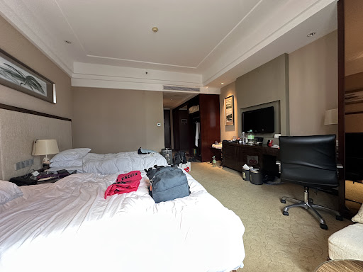 The room is big and has a large bathroom with a tub. Power sockets accept international plugs but voltage is 220V. TV only has CCTV channels so if you don't understand Mandarinor Cantonese, there are only a few channels.