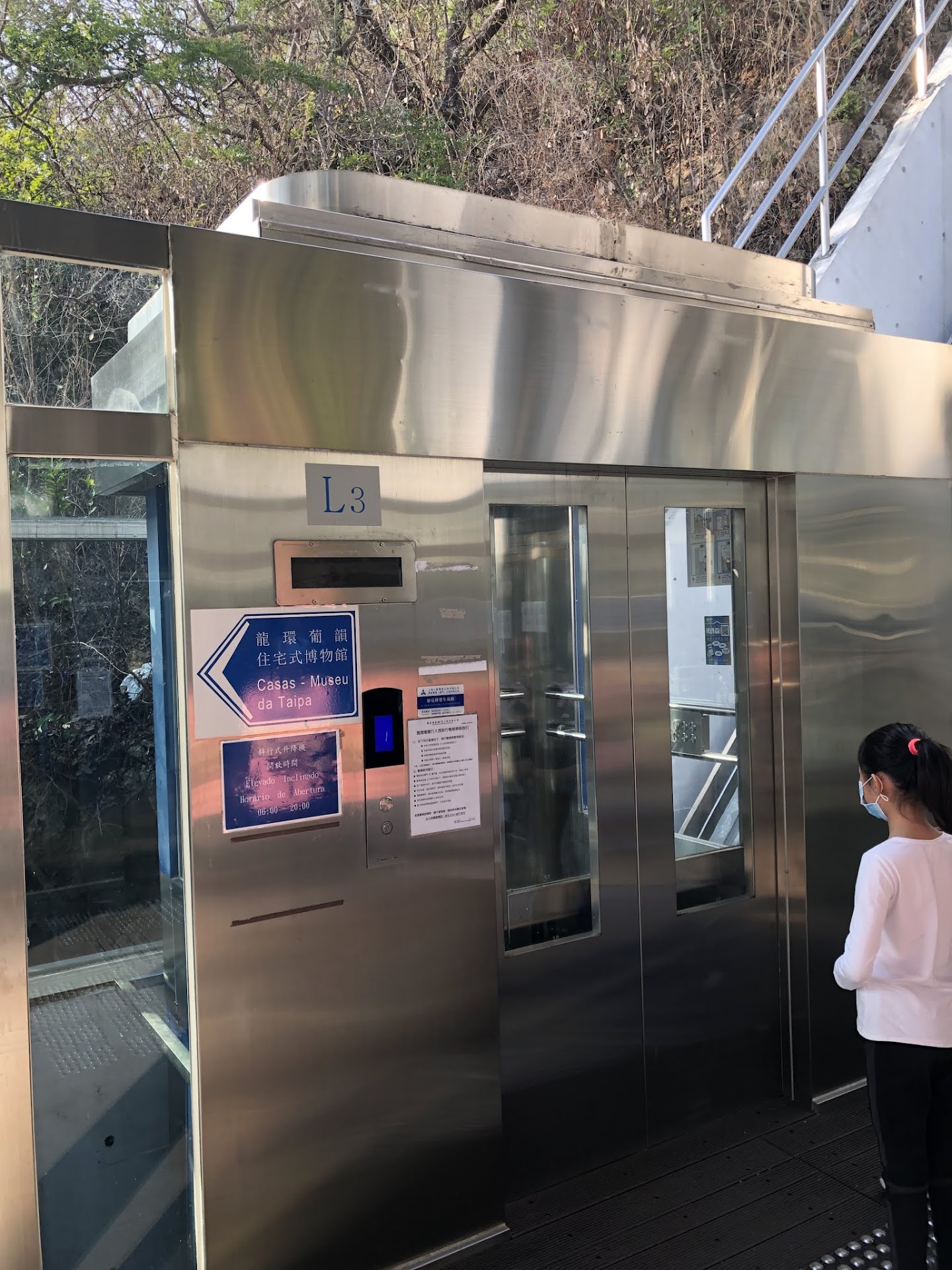 The lower station includes a bridge over Estrada Gov. Nobre de Carvalho, making it convenient to approach from the nearby Taipa Houses Museum and rural area around Dra. Laurinda M. Esparteiro Garden. From the platform at this lower station, you can enter either of the two lifts (free to use) and ride up to the viewing platform.