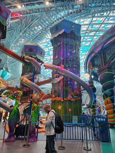 Next door to outdoor park is the newer Spaceship indoor park which has an Orca Killer Whale show, hammerhead shark tanks, dolphins, and various ecosystem fish displays. Then on the upper floor they have an indoor theme park with more kid friendly rides. Our 6 y/o loved this area more than outdoor park. The Bermuda Storm moving theater was the one ride that everyone could enjoy. The attached hotel has an infinity pool on the roof, but it is unheated and only useful for self indulgent glamor influencer pictures.