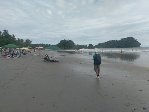 Read moreBeautiful light tan gently sloped (almost flat) beach. Great for young children with usually gentle wave action on the flattest parts of the beach. Extra wide beach at low tide. The water temp is always perfect year round. It is backed the entire 1.35 mile length by green tropical trees inhabited by monkeys, sloths and a variety of colorful tropical birds.There are high rises or commercial buildings at beachside. At the south end of the beach food/entertainment, hotels and souvenir shopping is very convenient but doesn't encroach the beauty of the beach itself. The entrance to world famous Manuel Antonio National Park is about 1/4 mile from the beach, and it has two very distinctive but smaller beaches of its own. There are plenty of kind and attentive Tico and Nico venders offering lounge chairs/beach umbrellas, parasailing, jet skis, surfing lessons and surf/body board rentals as well as snow cones, fresh chilled coconuts opened for you to enjoy cold coconut water. One travel magazine listed this beach as one of the top 15 in the world. I've enjoyed it nearly daily for two years. It's a lovely and charming bit of paradise....I've loved living here! ...