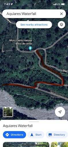 Great waterfall (small one and big one) but can be a bit tricky to find. So follow my images for parking location by Monumento Natural Arbol de Ceiba then the hiking path. We had to cross the river so plan to get wet up to your knees in the dry season (I would not suggest water crossing in wet season). Park by tree then go to blue circle and to the left is a narrow path. Follow that then take each right when the path splits until you end up forces into the river. Other visitors have stated to park my some bamboos or a property up in Aquaries but that will only get you to the top of the falls and is a very very sketchy hike (we tried...