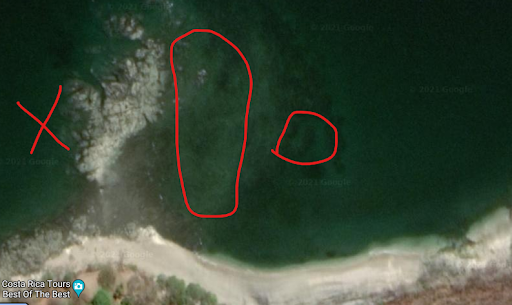 Great beach. Things to know: -- Go at high tide if you want to swim with a sandy bottom, hip to chest deep. There is a barrier of rock that shows at low tide, but at high tide it serves to break the waves a good bit before the nice sandy-bottom swimming hole. -- Go at low tide if you want there to be substantial beach area to be able to lay or sit on (this beach area is what becomes the sandy bottom swimming hole at high tide), OR if you want to snorkel. (more snorkel info below) -- Maria and others give massages on portable massage tables tucked up underneath the trees with clean linens and oil. Prices are quite agreeable (better than any of the spas in the towns, for sure) and yet it really is a VERY good massage. Maria. God bless Maria. -- There are stacks of lounger chairs that belong to the resort, but they don't mind other people sitting on them. -- As others have mentioned, bring your own food and drinks, and you do have to walk down a path from where you park your car in order to access the beach. -- SNORKELING. Please see the photo I have attached to see where the snorkeling is best. We went to the Left/ West side of the rock barrier thinking that since there were more rocks over there, there would be more sea life. Nope. Minimal life other than awful sea urchins and the water is sandy and murky. This area is marked with an X in the photo I have uploaded. Go to the Right/East side of the rock barrier (circled in the photo). There are some brain coral, but mostly small rock out-croppings and lots of life even between these areas. We saw puffers, angel fish, snowflake eels, lots of smaller fish we don't know the names of, trumpet fish, juvenile damselfish, a few seemingly lost Sargent majors, and a small stingray (so be careful where you set your foot down, and shuffle when in doubt). We liked this spot, but we did hear from our dive master the next day that they think Ocotal beach is better...