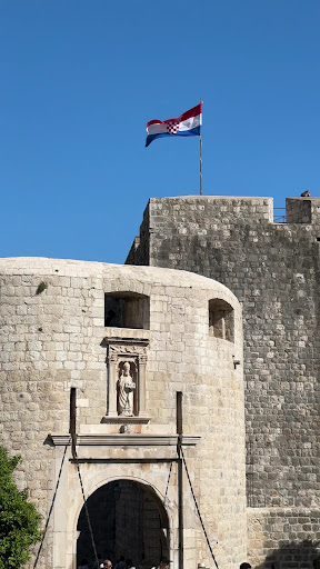 Approaching the gate, you’ll first cross a charming stone bridge over a now-dry moat, once filled with water for defensive purposes. Above the arch, the statue of St. Blaise, Dubrovnik’s patron saint, watches over visitors — a fitting guardian for this historic city. The outer gate is part of a layered defense system, with an inner gate and a short tunnel-like corridor that adds to the feeling of entering a fortress.