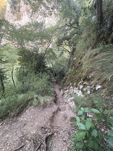 Let me mention that you have to park somewhere near the houses, because there’s nowhere else to leave the car. At the beginning the trail is fine and well marked, but then it starts to get more challenging. First you walk on a narrow path next to a small drop, then it becomes more dangerous, you walk over rocks, and eventually the trail gets so steep that there are ropes on the side leading to the cave and the waterfall. Except, in the end, there was neither a river nor a waterfall.