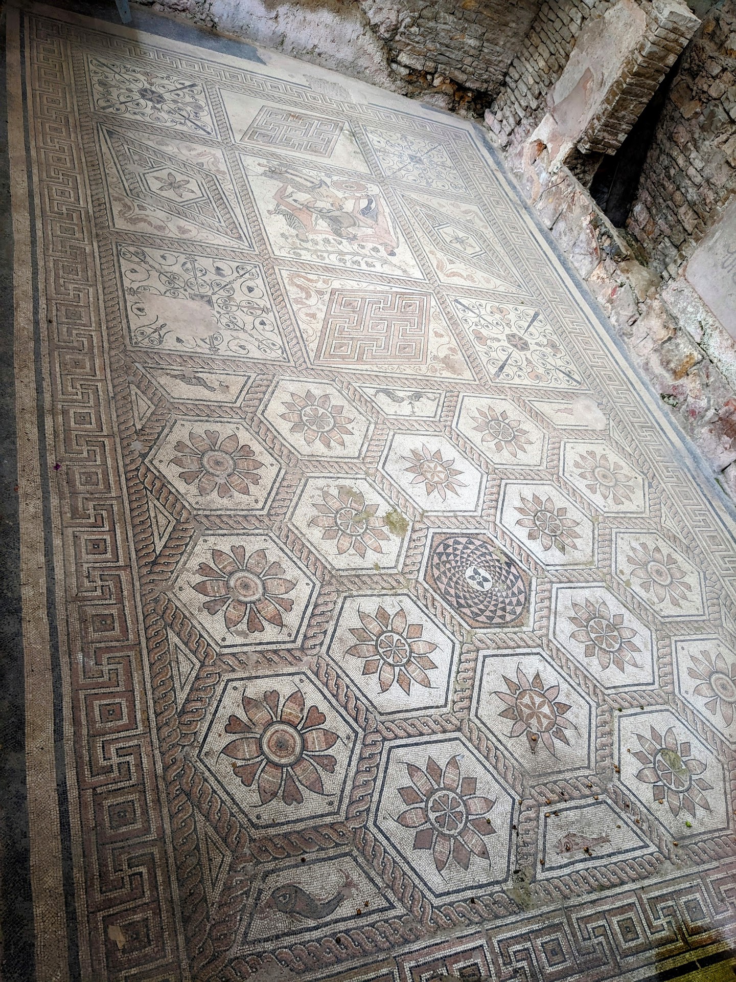 Pula is the only place in the world that doesn't appreciate her own history, the area is a back entrance in a building, no lights, no nothing, very, very bad. "The most impressive one is surely the floor mosaic with the central field presenting the mythological scene of the “Punishment of Dirce”(Amphion and Zethus are tying Dirce to an enraged bull, since out of envy Dirce had been cruel to their mother Antiope.) This figural scene presents the central field of a large floor mosaic composition (12 m x 6 m). The entire mosaic composition is divided into two equal sections with altogether 40 decorated areas dominated by geometrical patterns with animal details (fish and bird). The mosaic covered the floor of a central room of a Roman house, probably from the 3rd century. It has been preserved at the site where it was found, so that the level of house floors in the Roman times, which is 2 m below today’s level, is...