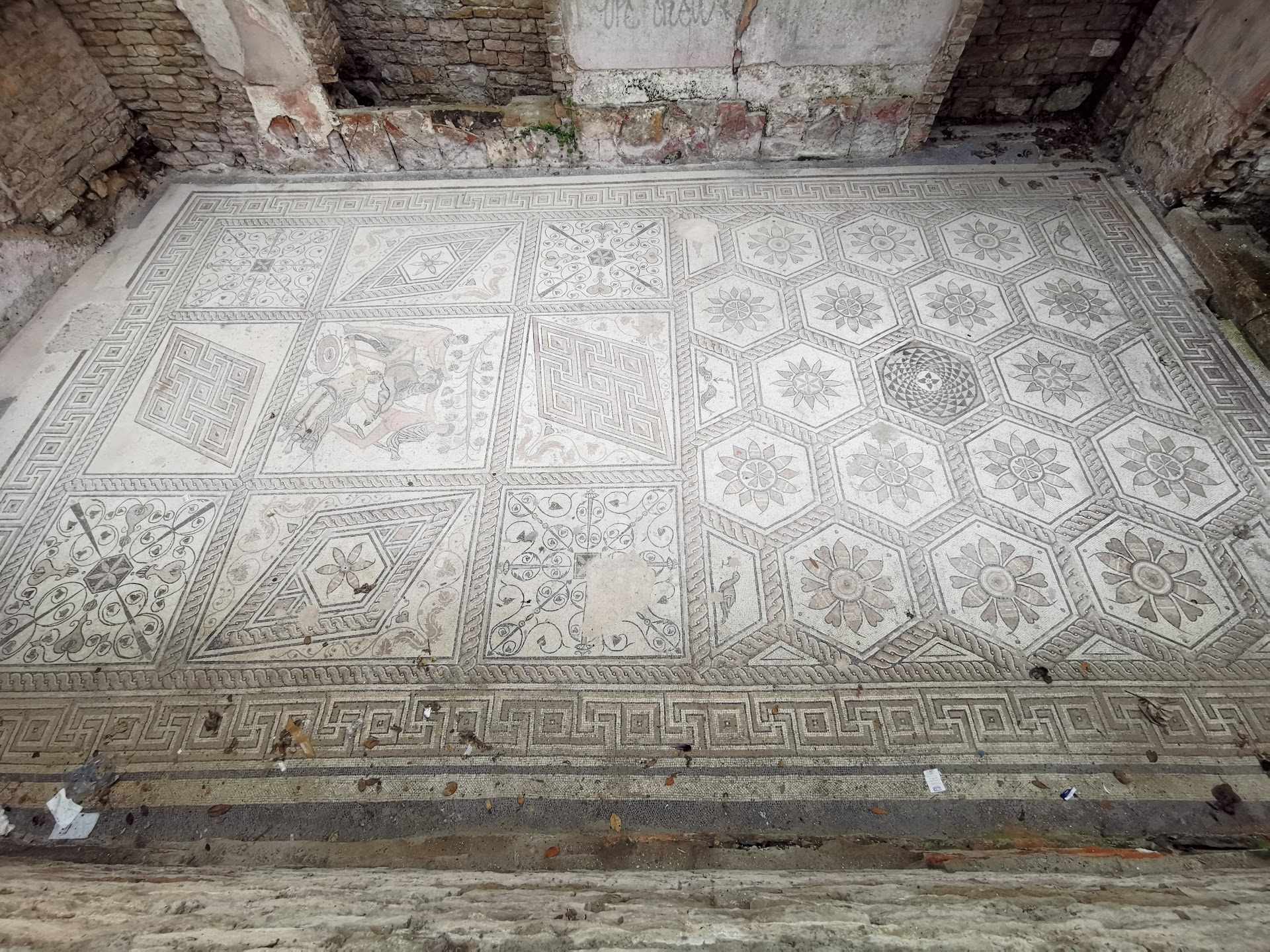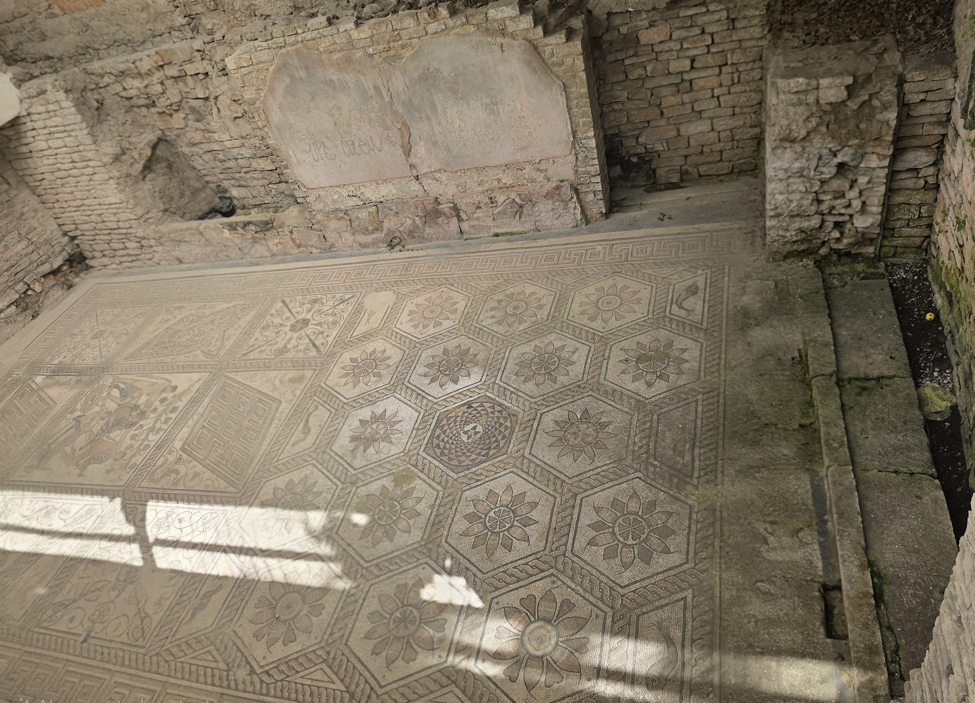 Read moreThis well-hidden site, tucked in a tiny location surrounded by residential homes, stores, and a parking lot, adds more to experiencing Roman Pula, than the more notable amphitheater, arch, and temple. This mosaic, very well executed and excavated, shows the punishment of Dirce, a Queen of a Grecian Region [perhaps Thebes?] being tied to a bull's horns as to be dragged to death, by two sons of Zeus whose mother she ordered killed. The mosaic itself is mainly geometric, but there are some scenes with animal and plant life in them. There is no admission, as the mosaic is practically in someone's backyard, and there is nothing between you and the mosaic besides metal bars, so don't lose you hat. Certainly...
