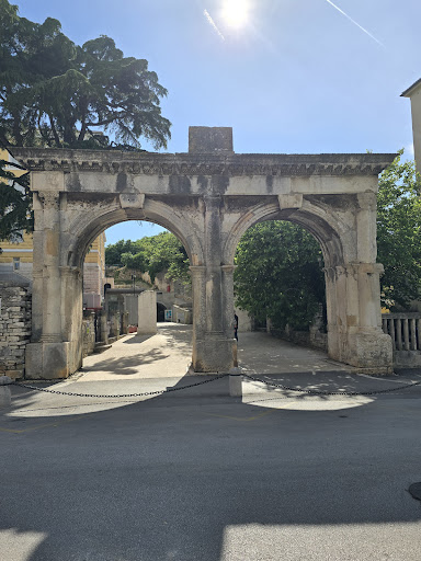 Read moreDvojna vrata (Porta Gemina) sagrađena su na ostacima ranijih vrata s dekorativnom funkcijom ulaza u antičko kazalište. Jednostavne su konstrukcije s dva lučna prolaza s tri polustupa ukrašena kompozitnim kapitelima. Reljefni vijenac cijeli sklop povezuje u harmoničnu cjelinu. U gornjem dijelu svoda lukova uočavaju se prorezi za spuštanje rešetaka kojima su se vrata zatvarala. Na gornjem središnjem prostoru nalazi se natpisna ploča od bijelog mramora koja spominje Lucija Menacija Priska koji je o osobnom trošku od 40.000 sestercija sagradio jedan od gradskih vodovoda Dvojna vrata jedna su od desetak vratiju koja su činila sastavne dijelove gradskih zidina grada Pule. U blizini Dvojnih vrata pronađeni su ostaci dijelom rekonstruiranog osmerokutnog mauzoleja iz 2., odnosno 3. stoljeća. Kroz Dvojna vrata ulazi se u dvorište koje vodi prema Arheološkom muzeju Istre i Malom rimskom kazalištu, odnosno...
