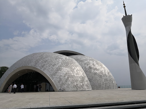The mosque consists of five domes and semi domes that visually constitute a single object done with reinforced concrete. The The 23 meters high minaret is the dominant element on the plateau; it consists of central conical steel cylinder and sheet-steel mantle.