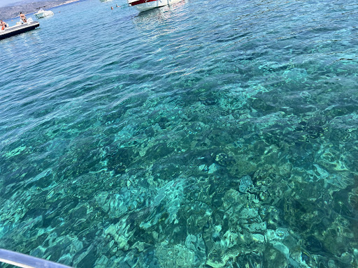 Water was gorgeous crystal clear blue. Our boat docked at the pier and we walked over to the beach, bar, blue mat entrance to the water. Be sure to bring water shoes if you plan on taking the mat into the water to swim. The entry to the water in front of the bar is very rocky and you must get through about 10 meters before being about thigh high to even think about going into the middle. On a Tuesday in July it was Very crowded in the water and there were only small fish and sea urchins to be seen as the crowds of people scare away anything bigger. I was really disappointed with the water /swim experience. The beach bar had tables under filtered awnings and was a nice retreat. They offered cocktails and some food options but they take Only Cash - no credit cards. There is an ATM machine conveniently located across the bar. I ordered a mango margarita which was served in a martini glass and seemed more like fancy juice than a cocktail. If you haven't experienced beautiful turquoise blue green water I'd say definitely go. But bring your...