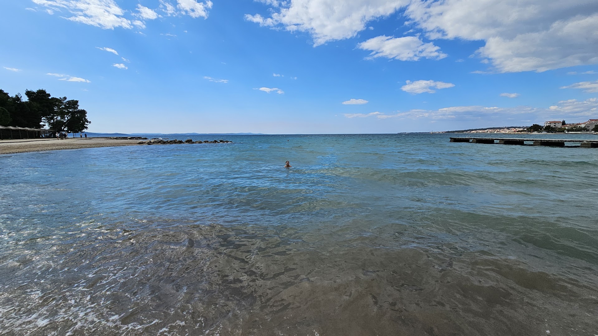 If you are used with sand beaches, don't go there with big expectations. You also need to have water shoes. There are some pontoons there. One of it is finishing in sand and it was a lucky event. You can rent sunbeds, but the shade is only under some trees. No umbrellas. The water is clean. From Zadar, this beach is at 4 km distance and I am not...