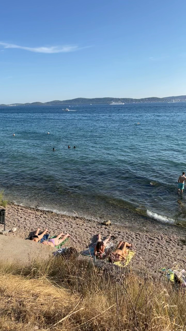 Spiaggia: la spiaggia, lunga e per lo più stretta, si amplia in vari tratti permettendo quindi di sdraiarsi senza essere troppo vicini gli uni agli altri. Inoltre, la presenza di pini e altri piccoli alberi garantiscono zone di ombra. La zona che si estende dal bar-ristorante Fontana all’inizio della ciclo-pedonale è piuttosto pulita, a differenza delle spiagge più a sud. Mare: l’acqua del mare è forse l’aspetto che più mi ha deluso durante la vacanza a Zara. Acqua pulita, ma fondale con sassi molto molto grandi e soprattutto scivolosi. A parer mio, di gran lunga superiore la qualità di acqua e spiagge di altre zone della Croazia (spiagge di Pag, dell’isola di brač e kasjuni a Spalato). In generale, spiaggia comoda per la città, ventilata; sicuramente non la consiglierei come spiaggia da visitare! Bellissima invece la ciclopedonale che costeggia la spiaggia!