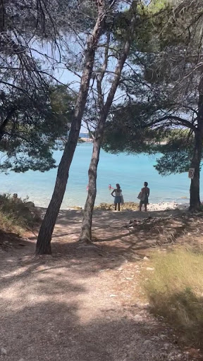 very crowded today (sat) even though we got there around noon. (sun bathing before noon is as much of a non-sense for us as eating before 8 pm! 😝😝) especially with many wooden lounge chairs, it was impossible for find a spot where you did not have to look at someone's back or having someone's feet over your head. for the most part everyone was quiet and soft spoken till a few french speaking groups came - screaming toddlers, vaping millennia and middle aged men, and breast baring middle aged women. with a very small opening, the beach is not pebble but rocky. (pebbles are round and smooth, rocks or gravels are sharp - you really do not want to slip on them or even touch them with your hands without extra care.) water was beautiful but not the most i have swam in croatia. maybe because everyone tells everyone else to come to this beach, it is no longer relaxing and calming. maybe because we are spoiled by other truly calm, relaxing swimming spots, and that i had the same expectations based on other reviews, at the end of day, it was over...