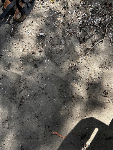 sandy beach small but not many people currently natural shade kids playground (only one in working condition in the bay) bar (cocktails) deck chairs and small plastic tables on the beach for...
