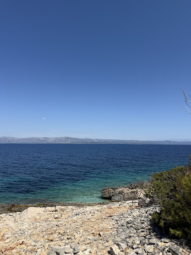 This is incredible beach, and while it’s absolutely stunning, it’s not the easiest to access. The coastline is lined with large, flat rocks and pebbles, creating a rugged, natural feel. The clear blue waters are mesmerizing, with shades ranging from light turquoise near the shore to deep blue further out. The view is complemented by lush greenery and rocky terrain in the background, adding to the secluded and untouched atmosphere.