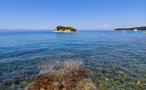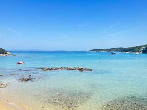 Read moreFajna plaża na cypelku, bardzo uniwersalna, każdy znajdzie coś dla siebie. Można wybrać stronę która bardziej odpowiada lub wejść na środek cypla. Najlepsza choć niewielka jest ta część po zejściu z cypla w prawo, z widokiem na małą wysepkę. Ciekawa do nurkowania rafa w wodzie już od samego brzegu, który jest piaszczysty (ale są też kamienie). Znaleźliśmy tam największe kolorowe muszle jakie widzieliśmy w Chorwacji. Woda płytka i ciepła, w sam raz dla dzieci. Głębsza i chłodniejsza też się znajdzie, po przejściu kilkunastu metrów od brzegu. Obok są restauracje z toaletami oraz betonowa część plaży. Można blisko zaparkować ma górce przed restauracjami lub nawet na samym cyplu jeśli...