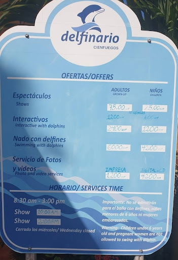 Delfinario works from 8:30-15:00 and they have 2 shows, one at 10:00 and another at 14:00. Swimming with delfins is possible, but only after the show. Prices are different if you are local and if you are a tourist. And it's a very big difference, they are ripping off tourists (more than x2 more expensive than for locals). The show is 10 euros/dollars The show with swimming with delfins after is 50 euros/dollars For swimming they don't allow you to take pictures, they do it with their camera and charge 10 euros/dollars per picture or 35 for all pictures. The photographer does not try to do a good job, they just do a lot of photos and they are not good, so that you would just pay for all and not search for at least one...