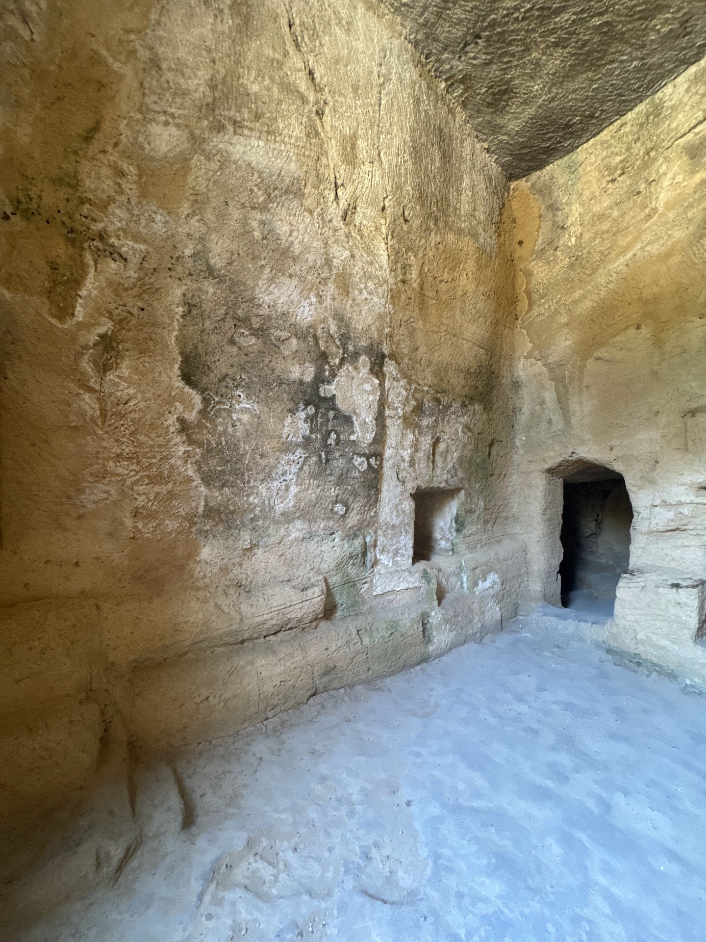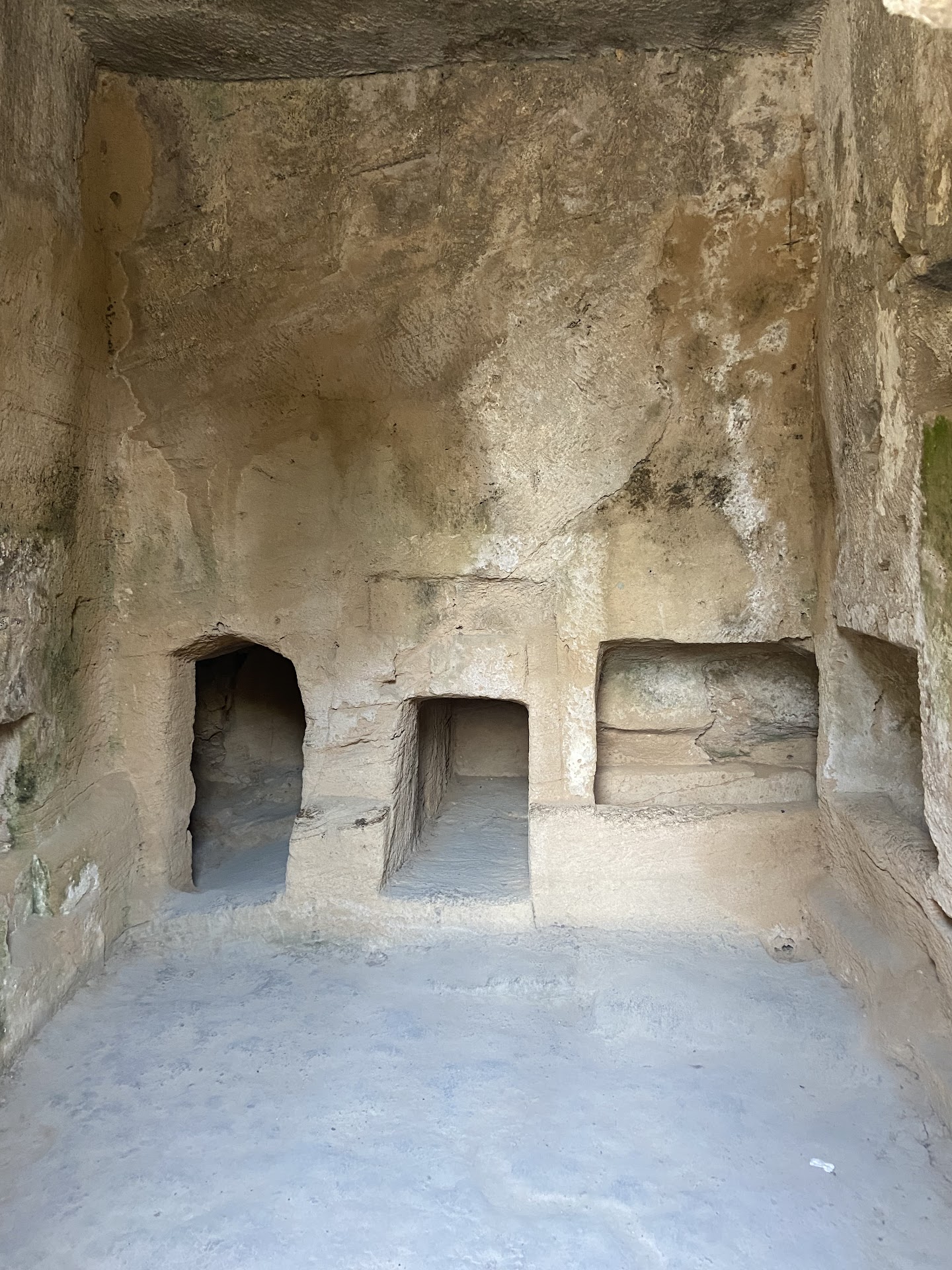 Tomb 1 is basically a hollowed out outcrop to form a burial chamber with loculi and ossuaries on three sides. The external sides of the rocky promontory have been chiseled and smoothed out. The remains of mortar and carved recesses point to the utilization of decorative architectural elements inside the chamber during Hellenistic and Roman times.