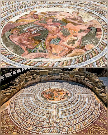 This mosaic floor depicts the mythical duel between Theseus and the Minotaur in the Labyrinth of Crete. In the center of the scene, Theseus is depicted holding a club in his right hand, while with his left hand, he grabs the horn of the Minotaur, who has fallen to his knees. On the left side of the scene is a personification of the Labyrinth as an old man watching the duel. Above the rocks is the personification of the island of Crete and Ariadne. The scene is framed by successive decorative zones that symbolize the Labyrinth. The frame consists of a chain of diamonds and colorful tresses that symbolize the thread of...