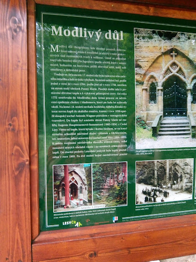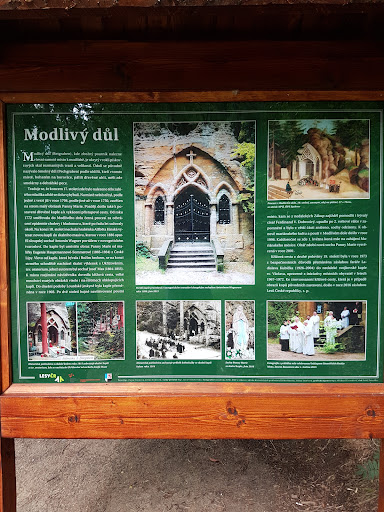 Modlivý důl is about 1 km long romantic rocky valley, deeply cut into sandstone massifs. The rocky ravine was originally called "Smolný důl" (the pitch pit), because the local coal miners had the pitch furnaces in which they cooked the grease. Only later did a place of pilgrimage arise here. The first picture depicting the farewell of the Virgin Mary with Jesus was said to have been hanged here in 1704 by a man named Melzer, working as an assistant in a Svojkov brewery. Over time, reports of miraculously prayers being granted spread across the region, and when in 1772 the lady von Czerwelli of Svojkov thought her plea had been heard, she gave thanks in gratitude to a wooden chapel in which Melzer's picture was placed. At the end of the 18th century, the wooden chapel was taken down and Countess Alžběta Kinská had built a new chapel carved into the rock wall. It was created by a mason...