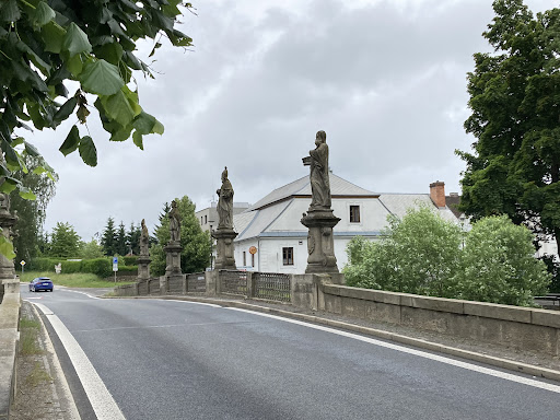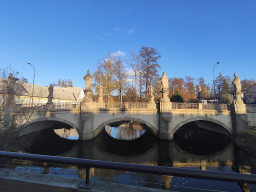 The magnificent forty-meter Baroque three-arched bridge made of granite blocks over the Stržský stream was built in the first half of the 18th century and replaced the original wooden bridge, which served as the main access to the monastery. In 1761, the abbot of the Žďár monastery, Bernard Hennet, the successor to Abbot Václav Vejmluva, decorated it with statues of eight saints. The decoration was inspired by the Baroque decoration of Charles Bridge in Prague. Column with the figure of st. John of Nepomuk stood since 1701 south of the bridge, in the same place as today. On one side of the bridge there are statues of St. Benedict, St. Nicholas, St. John and St. Cyril, on the other St. Bernard, St. Vojtěch, St. Paul and St. Methodius. The author of these sculptures is unknown. For each statue of a saint, there is a commentary on the high pedestal explaining the choice of the individual figures. In 2008-2009, original sculptures were replaced by high-quality copies during the complete reconstruction...