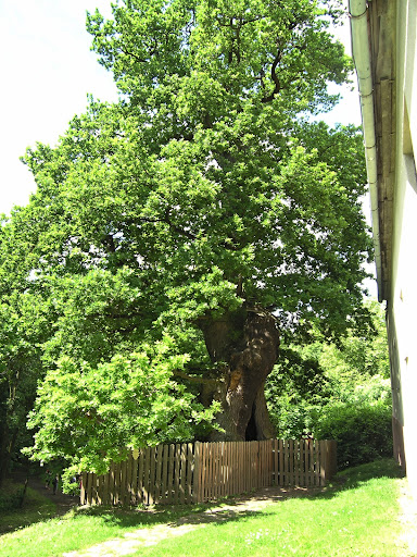 The really impressive 600 to 800-year-old Summer Oak in Podhradí near Třemošnice is one of the most significant trees in the Czech. It is one of the five most massive memorable oaks in the Czech Republic. It is called "Žižkův" (Hussite leader) on the basis of two expeditions by the Hussites, which conquered Lichnice Castle. However, none of the expeditions took part by Žižka himself. The tree was said to have stood at the original gate of the castle, where it was planted in 1250 when the castle was built. Today the oak is about 20 meters high, the trunk circumference is 900 cm. The tree is hollowed out in the trunk and up to 7 adults can...