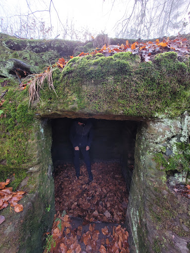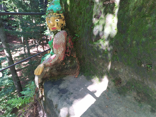 Miejsce tuż przy drodze, oznaczone w postaci pięknej starodawnej tablicy na wejściu przy schodkach. Zwiedzanie zajmie 10- 15 minut. Idzie się schodkami do góry oraz na boki. Spojrzenie w dół sprawia, ze dociera do nas fakt, iz jesteśmy naprawdę wysoko. Przejścia miejscami wydają się być strome, więc warto podtrzymywać się barierek - późną jesienią bywaja one zimne i mokre. W skałach zostały wyrzeźbione twarze krasnali. Nieznany artysta dokonał tego około 200 lat temu. Jest tez wejście do małego otwartego pomieszczenia/jest to podobno jaskinia. Można na chwilę zajrzec do środka. W listopadzie las był mocno zasnuty mgłą, a na drodze tutaj nie zastaliśmy nikogo. Przy drodze jest mały parking na...