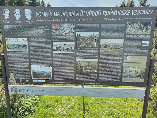 Read morePomnik docela prosty,ale vytvoren z pekneho kamene. Skoda ze 1.5.2024-nedlouho pred vzpominkovym vyrocnim pochodem uz zde na stozaru nevlaje ceska vlajka. Misto je ale ciste a jednoduse upravene, mozna by si zaslouzilo jeste prostranstvi mezi pomnikem a lipou svobody srovnani terenu. Stromy i kere jsou v dobrem stavu,upravene,zastrizene. Tabule s popisem v nekolika recech je dobre vyvedena a zachovala. Mozna pro starsi navstevniky by se hodila aspon 1 lavicka. Deska na kameni u vstupu s oznacenim "popraviste vzbourencu" by si take zaslouzila trochu ocisteni od...