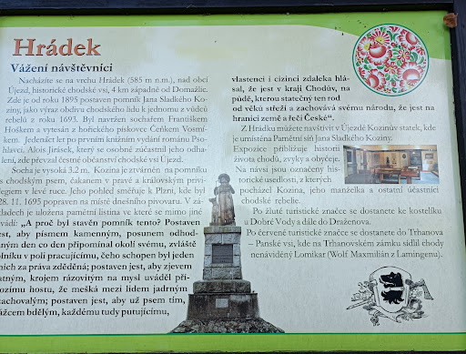 Na vrchu Hrádek u obce Újezd v okrese Domažlice najdete pomník jednoho z vůdců chodského povstání Jana Sladkého Koziny. Jan Sladký Kozina 1652-1695 byl prostý negramotný sedlák, který se později stal jedním z legendárních vůdců chodského povstání proti trhanovskému pánu Lamingerovi - Lomikarovi. Kozina symbolizuje odpor českého lidu proti německému útlaku v době temná. Za svou činnost byl 28. listopadu 1695 v Plzni popraven oběšením. Jméno dostal podle statku Kozinec, kam se přiženil. Na hranolovém kvádrovém soklu stojí přes tři metry vysoká pískovcová socha Jana Sladkého Koziny s čakanem v ruce a se psem u nohou z roku 1895. Slavnou Chodskou minulost připomíná socha Jana Sladkého Koziny a symbol pohraniční ochrany pes zvaný Chody. Obě díla stojí na vrchu Hrádek u obce Újezd u Domažlic. V rodném domě Koziny v Újezdu je menší muzeum. Hned vedle tohoto památníku je restaurace Chodská Chalupa. Pomník je zapsán na seznam kulturních památek. Pěkná památka můžem doporučit navštívit tuto památku i restauraci...