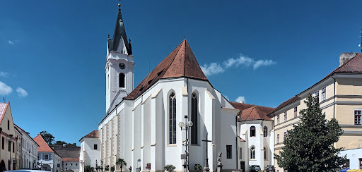 Kościół obejrzałem niestety tylko przez kratę. Uważam, że przynajmniej w niedzielę wszystkie kościoły po nabożeństwach powinny być w pełni udostępnione zwiedzającym. A kościół jest naprawdę wart bliższej uwagi. Wzmiankowany jest już w XIII wieku. Po ufundowaniu klasztoru augustianów w 1367 r. kościół przebudowano w stylu gotyckim. Gotyckie sklepienie podtrzymują cztery smukłe kolumny, a jedną z nich jest urocza rzeźba trzebońskiej Madonny. Najcenniejszym zabytkiem kościoła był niewątpliwie gotycki ołtarz z 1380 roku obecnie w muzeum w Pradze. Krużganek, który przylega od północnej strony kościoła, zachował się z prawie nienaruszonymi freskami. Na dachu nad wejściem widnieje pięciopłatkowa róża i data 1569. Po wschodniej stronie kościoła znajduje się krzyż i figury św. Jana Nepomucena i św. Wacława. Portal południowy jest strzeżony przez posągi św. Augustyna i...