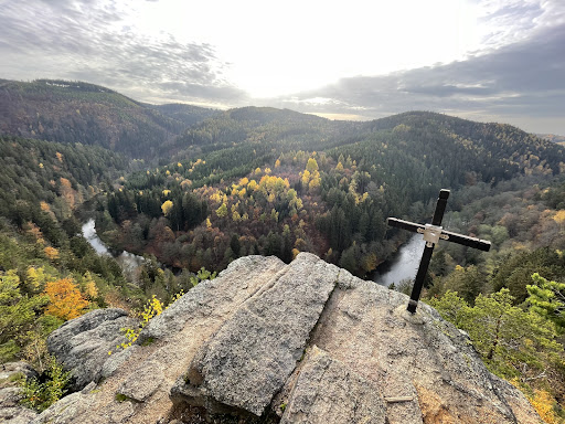 Wunderschöner Ausblick, würde eigentlich 5 Sterne geben, aber; es ist zwar leicht zu erreichen (kein anstrengender Weg), aber nicht leicht zu finden, da der Weg nicht gut gekennzeichnet ist. Am kürzesten ist der Weg von Loket aus Richtung Svatosske Skaly, nach dem Campingplatz kommt irgendwann links am Waldwegrand eine kleine Felsenhöhle mit einem Gitter davor, da links hoch laufen, dann kommt ihr oben an einem Wohnung an, von dort aus die grünen Zeichen an den Bäumen folgen, immer Richtung rechts laufen, auf dem Berg hinter der ersten großen Felsenformation ist dieser Aussichtspunkt. Ich habe es auch erst beim zweiten mal gefunden, und nach langer Suche. Es hat sich aber sehr gelohnt. Es müsste aber unbedingt besser gekennzeichnet sein, Google Maps zeigt leider nicht die Route an. Es muss unbedingt besser gekennzeichnet sein...