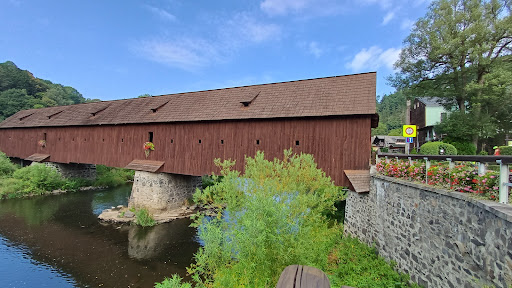 The covered bridge in Radošov replaced an old ford across the Ohře River. On the first of November 1310, King John of Luxembourg himself passed through the Ohře on his campaign to Prague. In 1364, Charles IV. granted to the city of Ostrov the privilege of building a bridge in this place and collecting customs duties. It was built entirely of wood, often damaged by fire and had to be constantly repaired. In addition to fire, it was often destroyed by the flood and in 1639 the bridge was reportedly demolished by the Swedes, in 1742 by French and during the Napoleonic wars it was partially dismantled, then again repaired with a new roof and even the new stone pillars were built. The bridge was preserved in this state until the second half of the 20th century. Unfortunately on 18 July 1986 under unknown circumstances it completely burned down, only stone pillars remained. Its reconstruction according to preserved plans and photographs lasted until 2003, when the new bridge was put back into operation. A 62.25 m long and 5.75 m wide bridge is permitted for motor vehicles weighing up to 5 tonnes. Roofing is done without using nails and screws, only with connecting of...