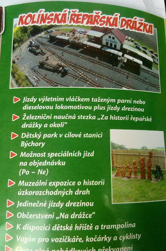 Read moreÚžasné místo. Na každé konečné stanici bylo k dispozici dětské hřiště. Měl jsem možnost se projet na drážce společně s dětmi při provozu parních i motorových vlaků nebo také při větších akcích jako například "Zahájení sezóny". Dětem se moc líbilo, největší náš obdiv získalo přepadávání vlaků kovboji. Ceny jízdenek i občerstvení z bufetu na nástupišti příznivé. Na drážku jsme se proto rozhodli jezdit pravidelně. Největším potěšením je pro nás na drážce především svezení historickými vagóny, a také personál. Nejmilejší personál se nachází v pokladně a informačním centru. Paní pokladní je milá a ochotná poradit, navíc Vám moc ráda odpoví na všechny dotazy, které budete mít.. 😉 Samozřejmě je moc hodný a laskavý i personál z řad průvodčích a bufetu, který je "pod taktovkou" již zmíněné paní pokladní, která jim tyto postupy ukazuje u příležitosti komunikace se zákazníky u pokladny. Celému týmu Kolínské řepařské drážky děkujeme za to, co dělají, protože dohromady odvádějí...