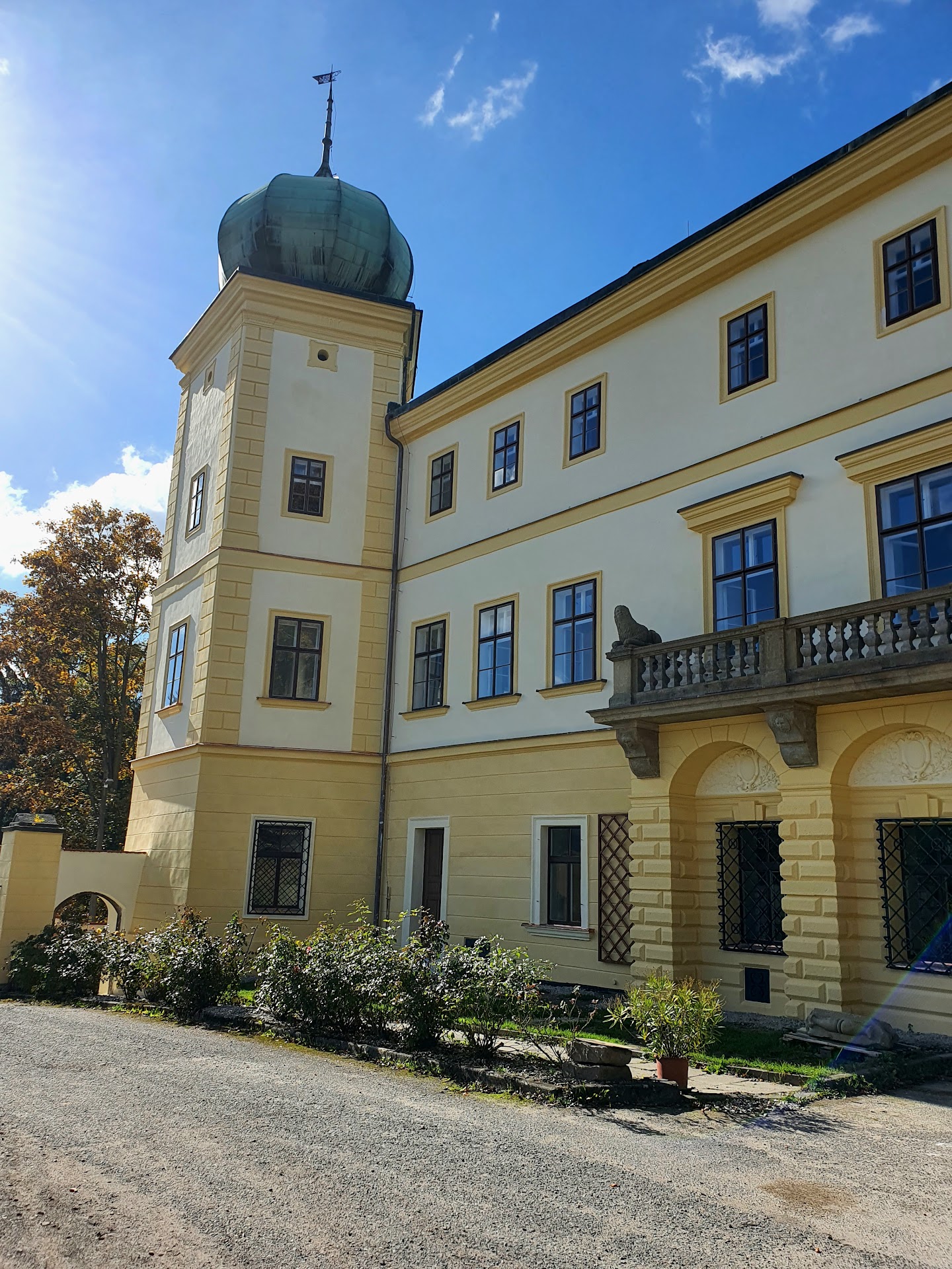 Architektura i otoczenie Gdy podjechałem pod pałac, od razu urzekł mnie neorenesansowy fronton z charakterystycznymi wieżyczkami i kolumnowym portykiem ozdobionym rzeźbami lwów. Choć w trakcie mojej wizyty trwały prace konserwatorskie fasady, całość prezentowała się schludnie i nadała miejscu kameralnego, niemal baśniowego charakteru. Położenie między wapiennymi skałami Rezerwatu Adršpašsko-Teplické skály tylko potęgowało to wrażenie – zamek wygląda jak wyjęty z dawnej pocztówki.