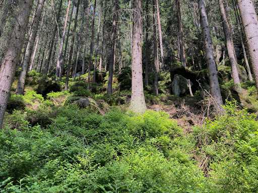 We walked along the skalný potok (stream) on the yellow trail. This serves as the "south entrance" to the main Adršpašské Skály park. After the initial ascent, the path is relatively flat as you walk along the stream between the hills. It's about 3-4 km (a little over 2 miles) long. You will begin to climb again when reach the Adršpach park trail (green), which is much more heavily trafficked and touristy.