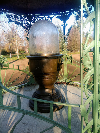 Váza je umístěná na žulovém osmistěnu, který je zastřešen baldachýnovou stříškou vynesenou na kovaných zdobných sloupcích. Celý altánek je nádherná kovářská práce z počátku dvacátého století, zdobená různými volutami, rostlinným dekorem, maskarony a štítky. Tvarově složitá, plechová baldachýnová střecha je z...