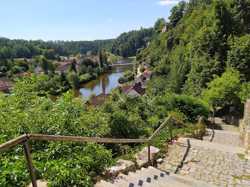 One of the most picturesque corners of southern side of Bechyně main square. You can find the staircase about halfway between the castle gate and the Franciscan monastery complex. If the 226 steps upwards (with several rest areas and a small niche chapel) are just too much for you, I recommend descending from the Klášterní Street to the right bank of the Lužnice river, from where you can get to the picturesque and poetic part of town called "Zářečí" (the place across the river) via a reinforced concrete footbridge. It's really wonderful here. On the way back, instead of stairs, you can choose a smoother and less steep climb along the road around the castle, where you pass the impressive Kohoutek tower (Rooster...