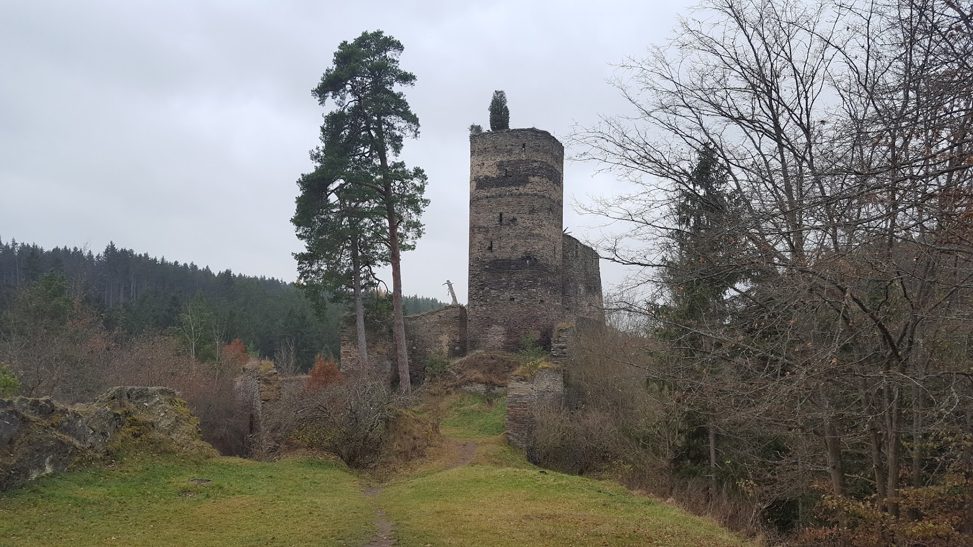 Nejvýraznějším prvkem v něm je hranolová věž, částečně dochovaná do výšky několika metrů, a zbytky hradeb a palácových zdí. To všechno obklopené lesem, který dává místu zvláštní klid a uzavřenost. Je to typ hradu, kde není moc co „vidět“, ale hodně co cítit.