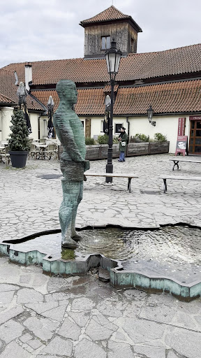 What's even more impressive is the setting in which this sculpture is located. It is situated in a small courtyard surrounded by beautiful historic buildings in Prague's Old Town. The juxtaposition of the modern, irreverent artwork against the traditional architecture is striking and adds to the sculpture's overall impact.
