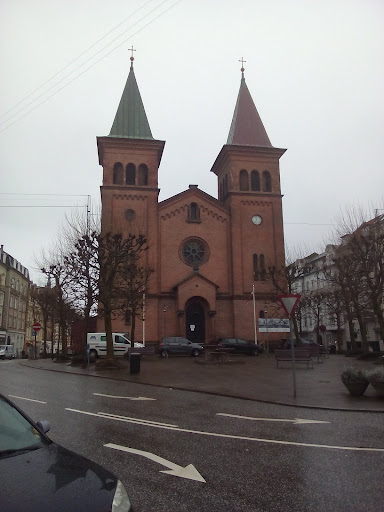 Located at the end of the slightly inclined M. P. Bruunsgade, the church was designed by Vilhelm Theodor Walther, Jutland's royal inspector of buildings, on land which was donated by the textile manufacturer Mads Pagh Bruun on condition the church should look towards the town. As a result, the robust, red brick building with twin towers bearing pyramidal spires has a facade facing north rather than west. The design is based on that of a Romanesque basilica with a long high nave, slightly lower aisles and an apse. The round-arched windows and doors are indicative of the Romanesque approach.