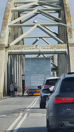 Træls oplevelse... Idag klemte en for høj lastbil sig fast på broen i sydlig retning. Meldingen lød på at det kunne tage alt imellem en time og indtil næste morgen at få fri passage over broen. Mange billister, heriblandt jeg selv, måtte vende og finde en alternativ vej. For mig blev det en tur over Aalborg for blot at komme til Rønbjerg Feriecenter som inden uheldet på broen blot lå ca. 20 min. kørsel væk...på den anden side af den fastklemte lastbil. Det blev så en omvej på 105 km. over "stok og sten" gennem diverse småbyer, vejarbejde samt myldretrafik i og omkring Aalborg....men det gik ellers fint😊