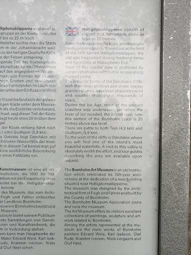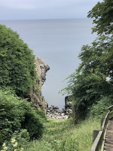 This is a great spot for a looooong walk and watching the scenery. You can walk along the road and just now and then stop at the many vantage points to look a the cliffs. All the way on the left a boat arrives from Gudhjem (I'm not sure you can take it from there to go to Gudhjem). There is a nice little spot you can descend to with a long stair case that has a boulder beach. Know that if you descend, you also have to get back up. One of the steps close to the bottow broke, but luckily it's not a big leap...